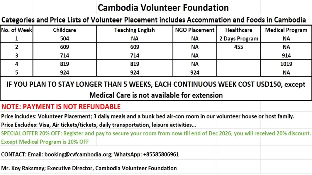 Join meaningful grassroots programs that uplift Cambodian communities while growing your skills, confidence, and global perspective. Volunteers are accepted from 18 Years old up to 70 Years old only. If Children must come along with adult.